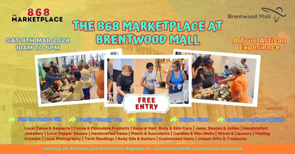 Calling all #TriniFam! Get ready for a day of good vibes, unique finds, and family fun at the 868 Marketplace happening Saturday 9th March 2024, 10am-6pm at Brentwood Mall!