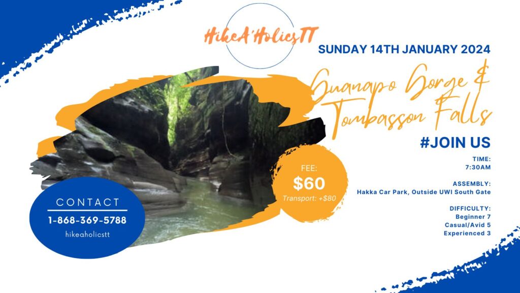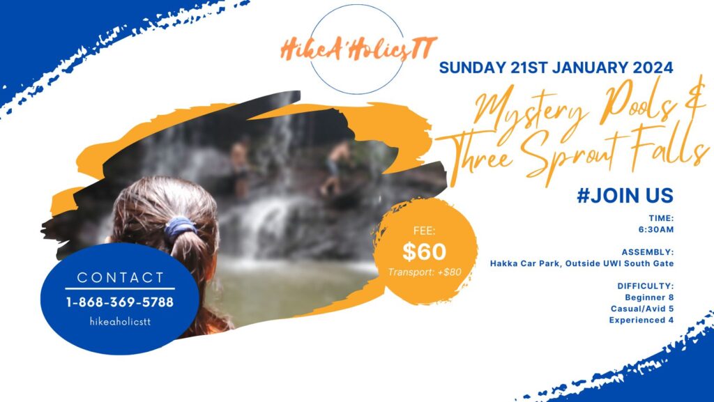 ASSEMBLY: Hakka Car Park (Outside UWI South Gate) DATE: Sunday 14th January, 2024 TIME: 7:30am DIFFICULTY: (OUT OF 10) Beginners 7 Casual/Avid 5 Experienced 3 FEE: Hike $60 Transport $80