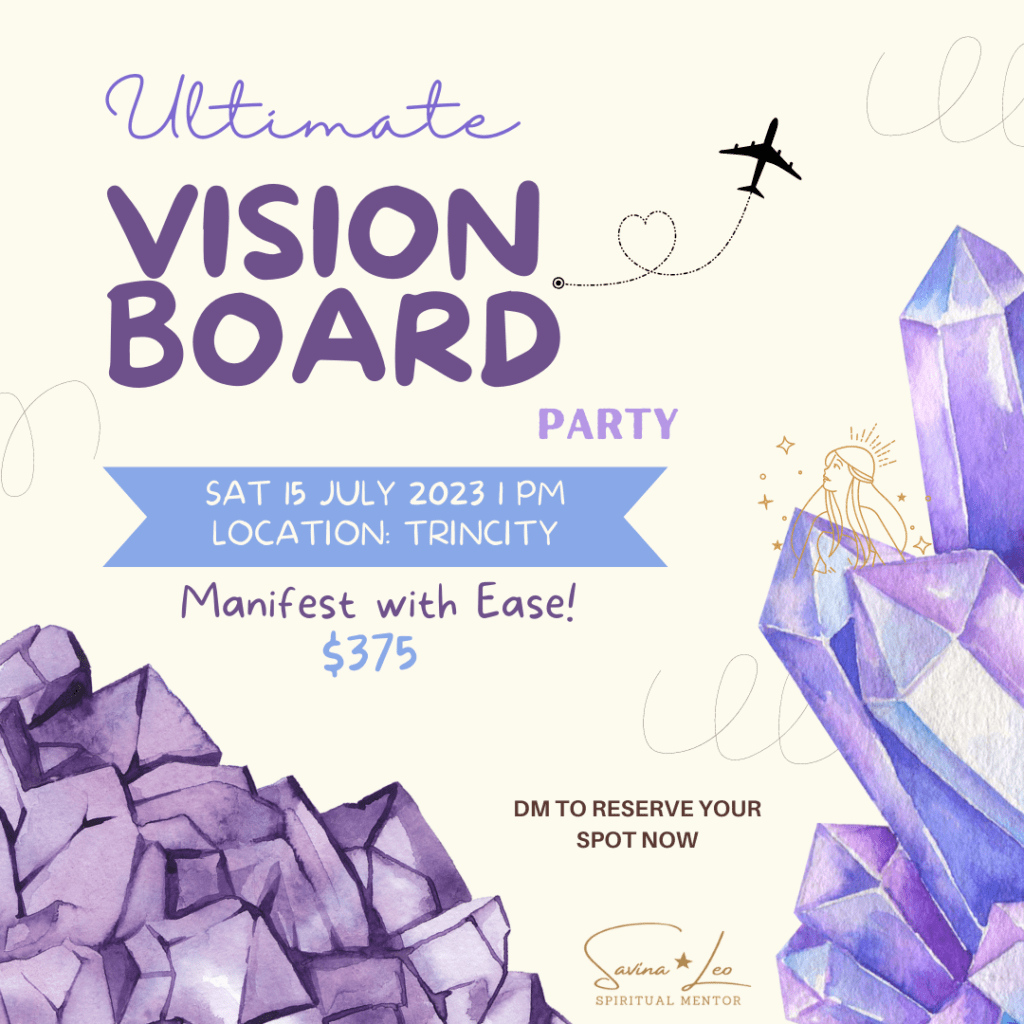 Come create a stunning & inspirational Vision Board with your favorite spicy Spiritual Mentor Savina Leo. ???? Saturday, July 15th, 2023 1 pm $375tt Trincity You will be provided with:
