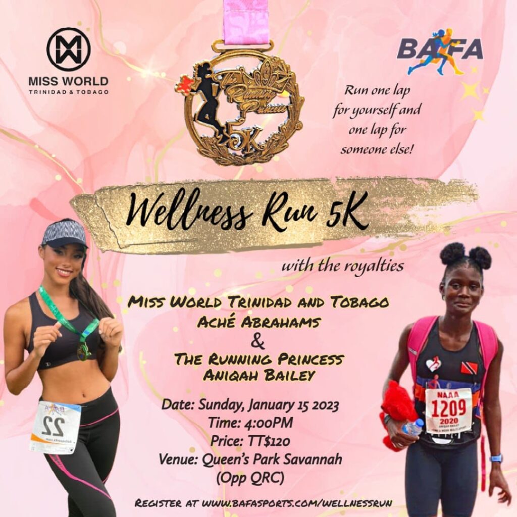 Join us for a Wellness Run as we tackle mental health with the royals. Miss World Trinidad & Tobago Aché Abrahams and the running princess, Aniqah Bailey. The course is