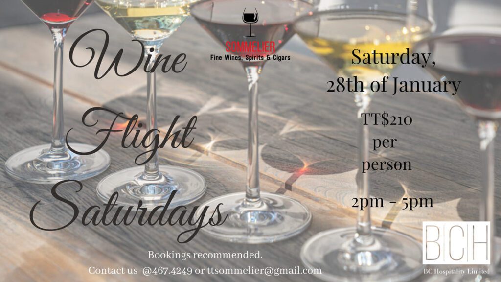 Swirl. Smell and Sip! Join us on Saturday afternoon to get your wine flight! A Wine tasting sampling of 3 different wines selected by Brendon Charles, Sommelier. TTD210 per person