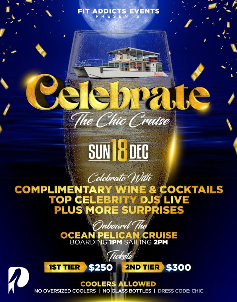 Fit Addicts Events Presents ????✨CELEBRATE✨???? The chic cruise ????On Board???? The Ocean Pelican ????Sun 18 Dec 2022???? ⏳Boarding 1pm sailing 2pm⏳ Celebrate (verb) acknowledge a significant or happy day or