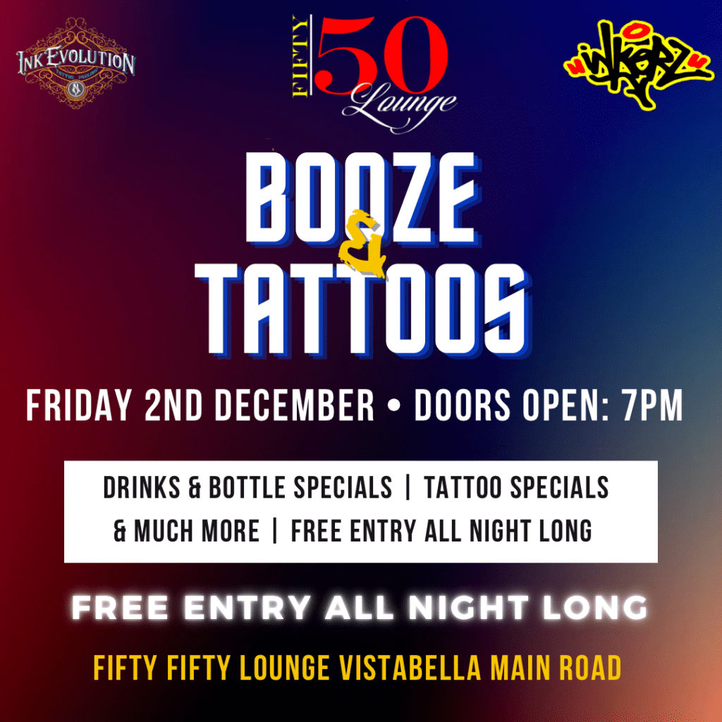 Friday 2nd December Fifty Fifty Lounge | Vistabella Doors Open: 7pm – Till Free Entry All Night Long ! • Live Tattooing & Specials Done On The Spot • Drinks