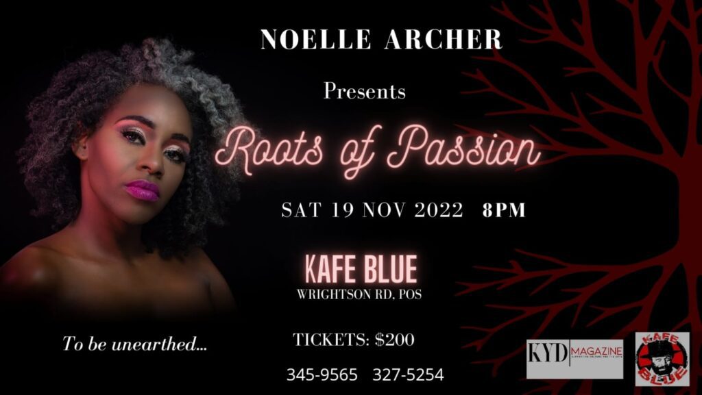 Noelle Archer presents Roots of Passion. Happening Saturday November 19th 8:00PM at Kafe Blue Rightson Road Port of Spain Prepare to be unearthed!!