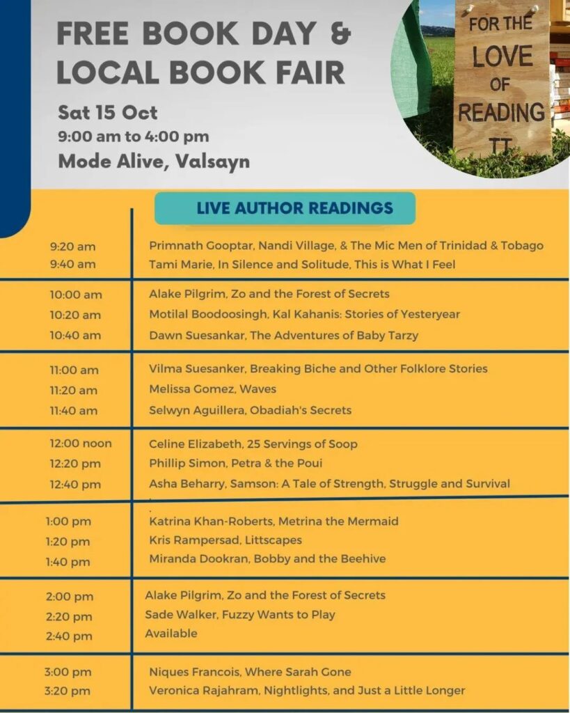 Check out our line-up of live readings for our upcoming Local Book Fair! This Saturday 15th October at Mode Alive Valsayn, alongside our Free Book Day! Authors will be